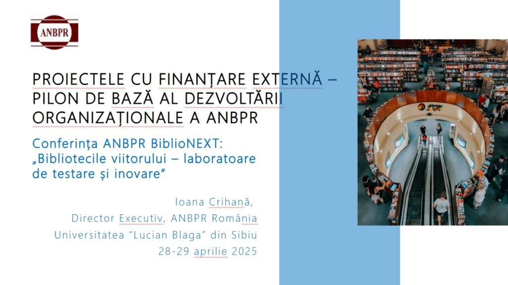 During the National Conference of Librarians and Public Libraries – BiblioNEXT, organized by the National Association of Librarians and Public Libraries of Romania (ANBPR) on April 28–29, 2025, in Sibiu, Executive Director Ioana Crihană presented the progress and achievements of several European projects coordinated by ANBPR, with a particular focus on the Erasmus+ project NEDLib – “Digital Competence and Information Literacy for Librarians.”